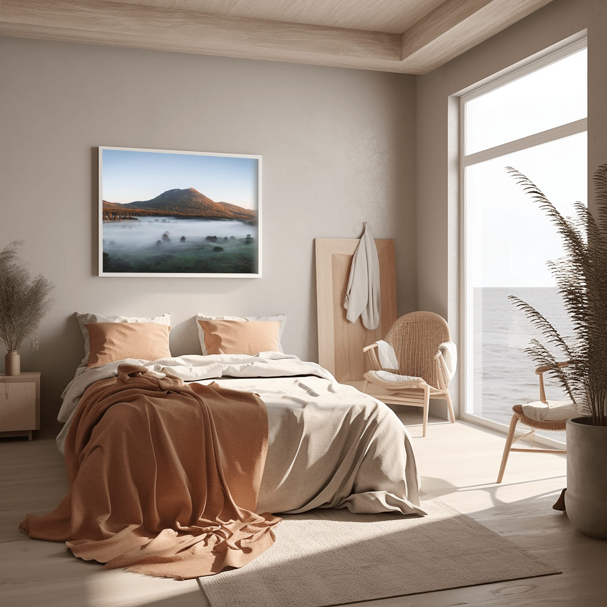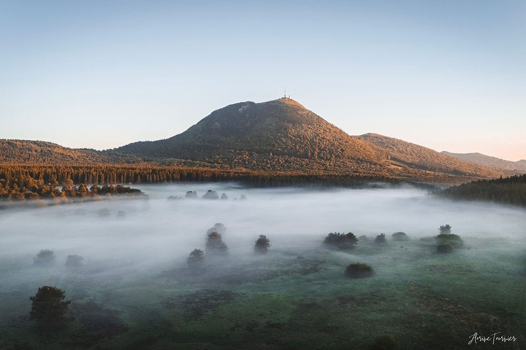 Je rêvais depuis des années de capturer le Puy de Dôme enveloppé de brume. Un matin d’été, vers 5 heures, j’ai tenté ma chance. En arrivant à la chapelle Saint-Aubin, la fraîcheur du sol rencontrait la chaleur de l’air, créant une atmosphère douce et irréelle. J’ai sorti le drone sans attendre… et la magie a opéré. J’espère que ce cadre du Puy de Dôme enveloppé de brume trouvera sa place dans votre lieu de vie.