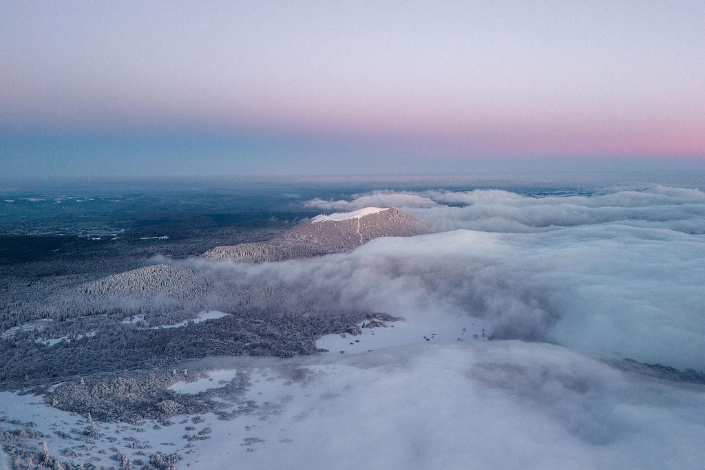 La veille, les prévisions étaient formelles : chutes de neige et mer de nuages au petit matin. Réveillée de bonne heure, j’attaque la montée du Puy de Dôme. L’ambiance est irréelle, presque magique. Je sors le drone et capture le Puy Pariou, saupoudré de neige et entouré d’une mer de nuages. Je n’aurais pas pu rêver mieux. J’espère que ce cadre du Puy Pariou sous la neige trouvera sa place chez vous.